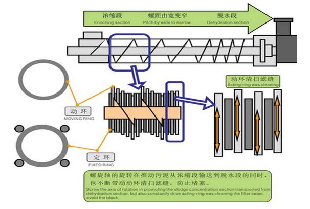 1、濃縮:螺旋推動軸轉動時,設在推動軸外圍的多重固活疊片相對移動,在重力作用下水從相對移動的疊片間隙中濾出,實現快速濃縮。