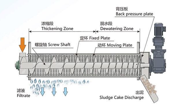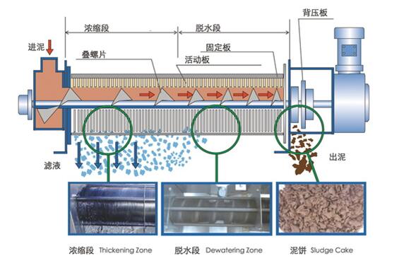 2、脫水:經過濃縮的污泥隨著螺旋軸的轉動不斷往前移動;沿泥餅出口方向,螺旋軸的螺距逐漸變小,環與環之間的間隙也逐漸變小,螺旋腔的體積不斷收縮;在出口處背壓板的作用下,內壓逐漸增強,在螺旋推動軸依次連續運轉推動下,污泥中的水分受擠壓排出,濾餅含固量不斷升高,最終實現污泥的連續脫水。