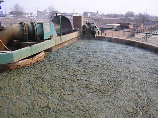 連接在旋轉布水機構上的刮板將池底和池壁上的污泥刮集到集泥斗中定期排放。
